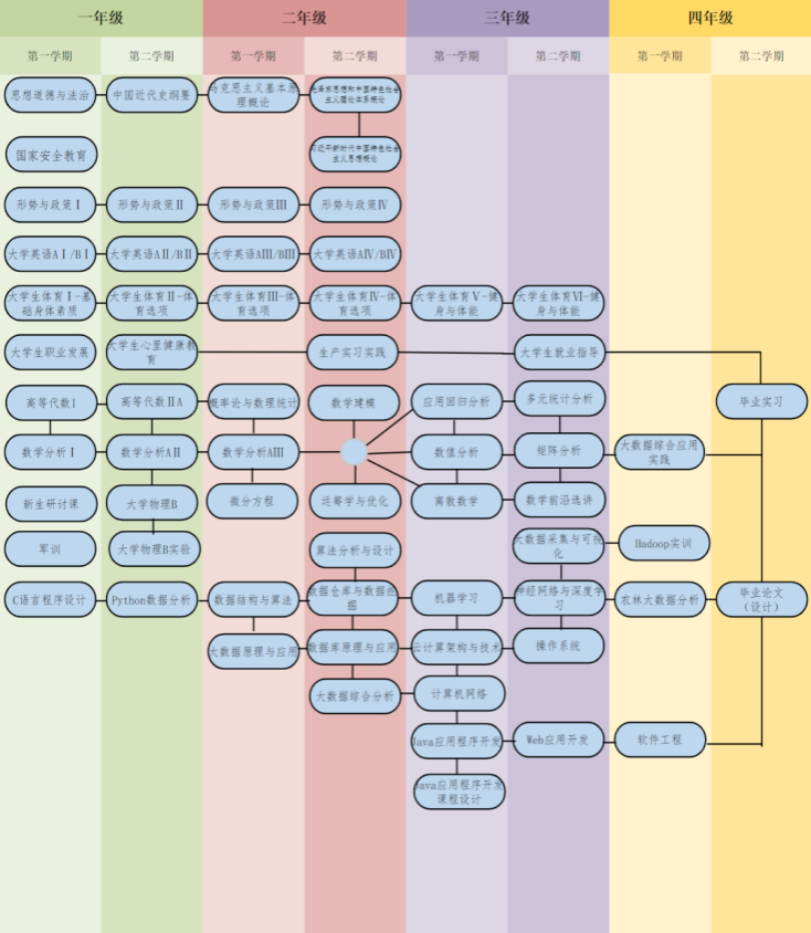 Guided by Xi Jinping Thought on Socialism with Chinese Characteristics for a New Era and centering around the fundamental task of fostering virtue through education,this major cultivates compound and interdisciplinary talents who can meet the needs of national, industrial and local economic and social development, have good political qualities and moral cultivation, master solid basic knowledge, theories and technologies of data science, as well as basic knowledge in the fields of mathematics, statistics, computer science, natural science and social science for big data applications, possess engineering practice ability, innovation ability and continuous learning ability, and can be engaged in related work in the fields of big data system development, operation and maintenance, big data analysis and mining.