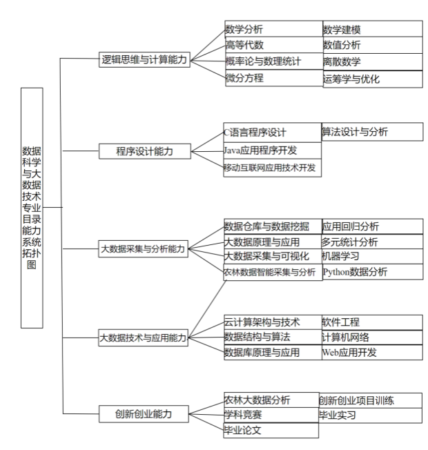 The major of Data Science and Big Data Technology takes agricultural and forestry big data as its basic feature. It focuses on cultivating students' basic abilities in scientific and technological innovation such as mathematical modeling, algorithm design, programming, data analysis and mining, and system architecture, as well as key skills in data cleaning, storage and retrieval, communication, and statistical analysis for data science. The curriculum system is closely integrated with the big data industry chain and the information technology industry chain. After continuous exploration and continuous improvement, this program has the following features: