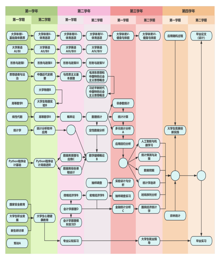 Guided by Xi Jinping thought on socialism with Chinese characteristics for a new era, and centered on the fundamental task of moral education, this major aims to cultivate advanced applied talents that meet the needs of society and economic development. The program aims to cultivate senior applied talents who meet the demands of social and economic development, establish correct worldviews, outlooks on life, and values, possess good humanistic literacy and moral quality, can communicate and cooperate with others in a multidisciplinary and cross-cultural context, and can independently learn to track cutting-edge technologies in the field of statistics and apply them to the analysis of practical problems. Graduates are expected to engage in complex data collection, analysis, and processing in administrative, public service, and corporate units, and to develop comprehensively in moral, intellectual, physical, aesthetic, and labor aspects.