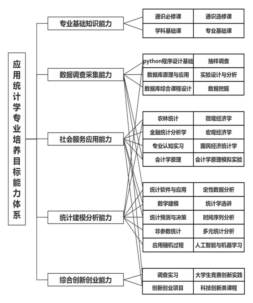 The training program for the Applied Statistics major focuses on the cultivation goal of combining statistical theory with data analysis, implementing a comprehensive curriculum system that combines general education courses, disciplinary professional courses, personalized development courses, and extracurricular education courses. It constructs a closed-loop talent training model that deeply integrates "industry, education, teaching, competition, research, and innovation", and fully explores students' innovative and entrepreneurial abilities. After continuous exploration and continuous improvement, the features of this training program are as follows: (1) Based on the OBE (Outcomes-Based Education) educational philosophy, this program focuses on the comprehensive professional literacy of students in the areas of statistical modeling, artificial intelligence, and big data processing, aiming to cultivate statistical application talents that meet the demands of society. The research report before the revision of this training program shows that employers have a high overall satisfaction with the graduates of this major. (2) Emphasis on the cultivation of students' practical abilities. A variety of practical courses are offered, combined with teaching practice bases, competition innovation practice, and agriculture and forestry characteristic courses, to carry out innovative entrepreneurial activities, strengthen the awareness of innovation and entrepreneurship, and promote the cultivation of innovative talents. (3) Multidisciplinary integration. A variety of courses from economics, management, agriculture and forestry, computer science, and other disciplines are offered to enhance students' abilities to work in teams in a multidisciplinary context.