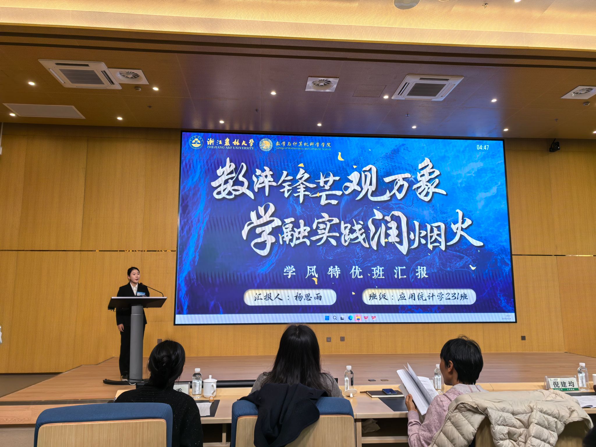 答辩环节,应用统计学231班杨思围绕学风建设、竞赛实践、志愿奉献三大板块,条理清晰、全面系统地汇报了班级的学风建设成果,生动展现了班级积极向上、团结奋进的良好风貌,赢得了评委们的高度认可。