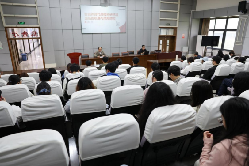 4月16日,校党委宣传部与数计学院联合举办人工智能活动季暨零壹讲坛第20讲,浙江农林大学数字乡村研究所副所长、数计学院武斌老师应邀作题为“智能体时代高校科研环境的机遇与风险防控”的防控报告。校党委宣传部部长晋杜娟,数计学院党委书记何振波和150余名师生参加活动。
